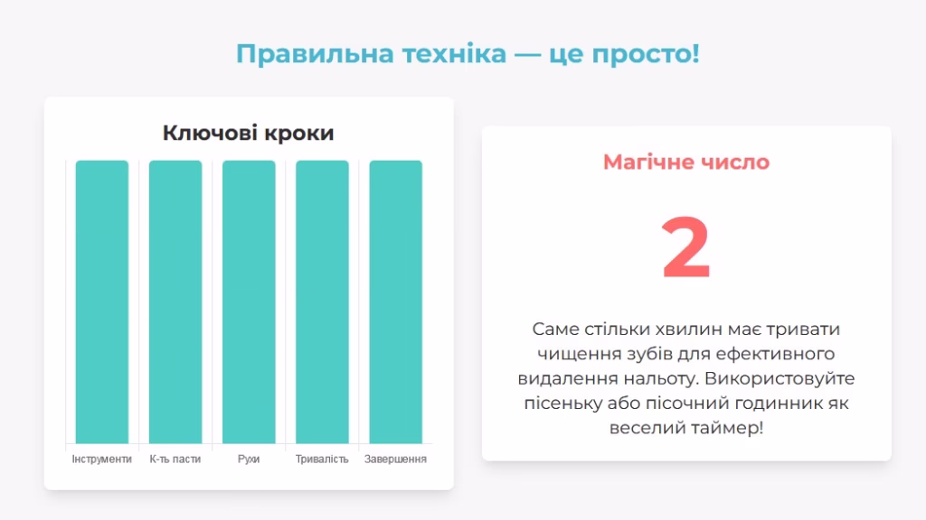 - Тривалість. Процедура має тривати не менше 2 хвилин. Використовуйте пісеньку або пісочний годинник.